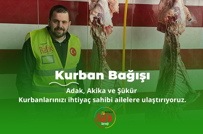 Rafık Derneği olarak, Adak Kurbanı, Akika Kurbanı ve Şükür Kurbanı gibi tüm kurban bağışlarını kabul etmekteyiz. Bağış yapmak isteyen hayırseverler, web sitemizdeki kurban bağışı sayfasından online kredi kartı veya havale yöntemiyle bağış yapabilirler.